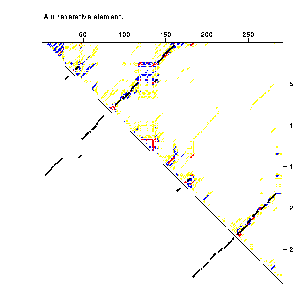 Figure 4: A color energy dot plot for the Alu sequence. The optimal folding energy is -114.5 kcal/mol. The upper right dot plot has an 11.4 kcal/mol energy increment (10%), while the lower left plot contains only the optimal base pairs.